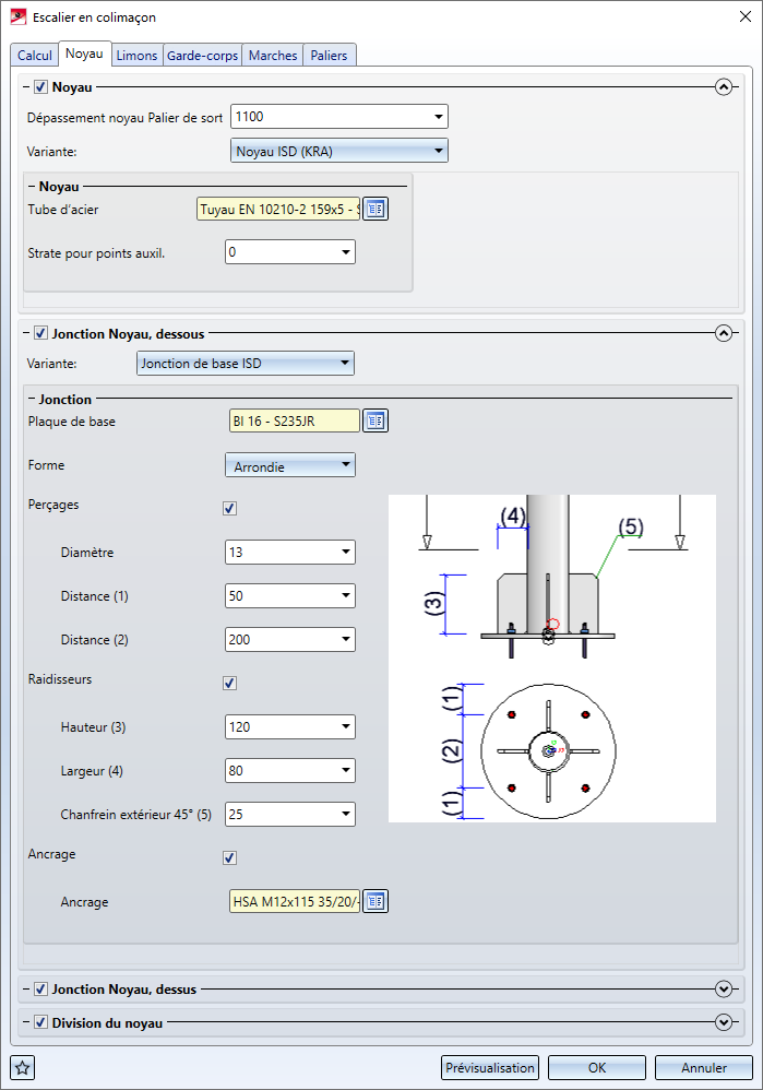 Le nouvel outil Escalier en colimaçon dans la fenêtre d'ancrage Fonctions bâtiment constitue la première ébauche d'un configurateur pour les escaliers en colimaçon. Il ne dispose pas encore de toute la gamme de fonctions. Avec les prochaines versions de HiCAD, cet outil sera amélioré en un configurateur entièrement fonctionnel avec différentes variantes pour l'axe (noyau ou pylône central), les limons, les paliers, les garde-corps et les marches, des règles de cotation spéciales pour la dérivation des dessins, etc.