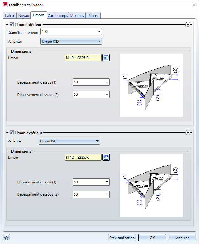 Dans cet onglet, vous choisissez de quelle variante sera le limon, les dimensions du limon ainsi que le dépassement au-dessus et au-dessous par rapport au marches.