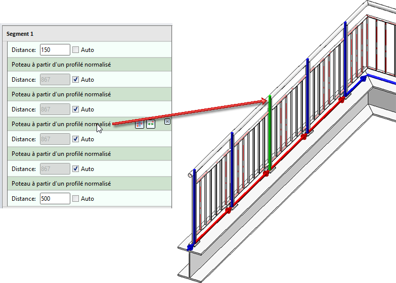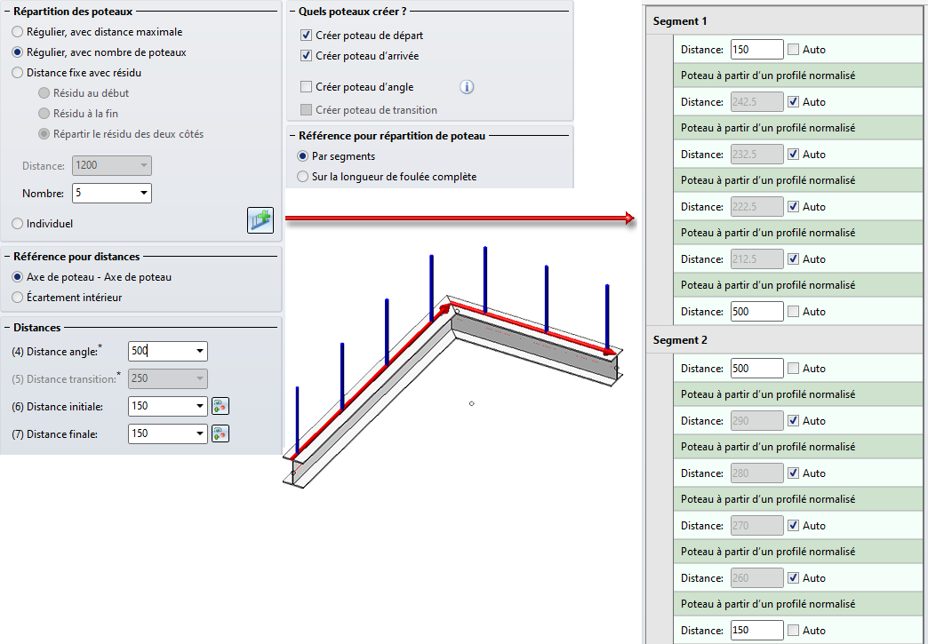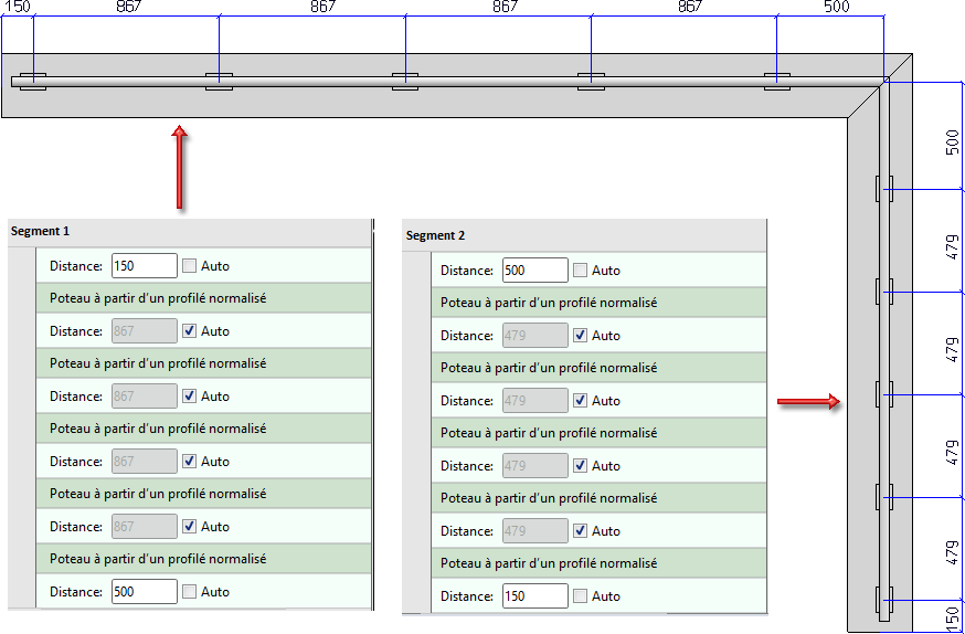 Le paramétrage Par segments est utilisé notamment pour les garde-corps de balcon. Les poteaux seront ordonnés ici dans les angles de manière régulière et les zones angulaires seront remplies de façon égale.