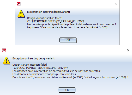 Si la répartition des poteaux n'est pas possible à partir des données indiquées, par exemple parce qu'aucune distance n'est définie entre deux poteaux ou parce qu'un poteau se trouve par la saisie indiquée en dehors du segment, un message d'erreur apparaît.