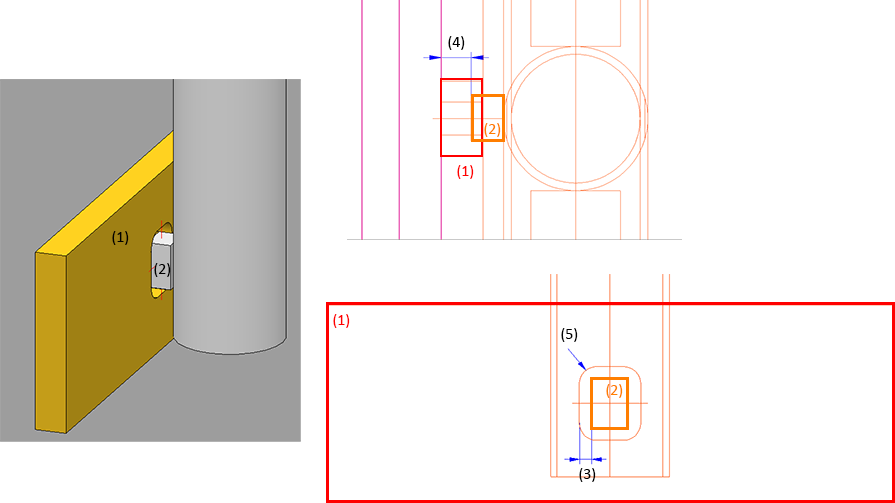 Si la fixation a lieu avec un élément de distance, il est alors possible pour la jonction latérale que l'élément de distance traverse la platine de base. Cochez dans ce cas la case Pénétration dans la platine de base et déterminez le jeu de coupe, le rayon d'angle et l'offset.