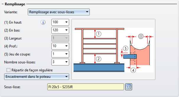Si les sous-lisses doivent être réparties de façon régulière, cochez alors la case correspondante. Pour les sous-lisses au poteau, vous disposez d'une liste de choix :