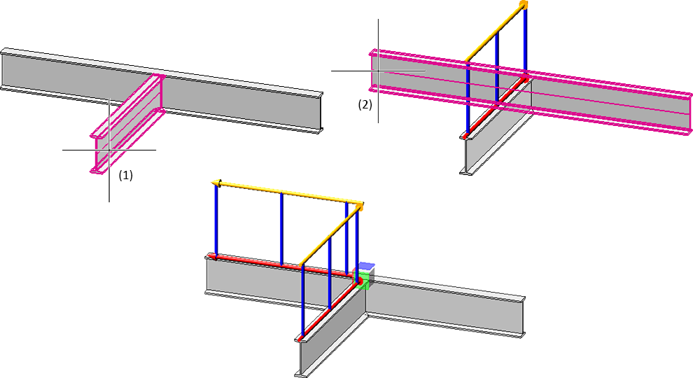 Au cas où plusieurs poutres se suivent en alignement, les éléments du garde-corps de ces poutres seront regroupés sous un ensemble de segments. Sont alors rattachées également à ces poutres, de façon continue, les mains courantes et les lisses. L'actualisation et la modification des garde-corps existants (créés avant la Version 2016 SP2) seront toujours effectuées avec des ensembles de segments séparés et des mains courantes et des lisses non continues.