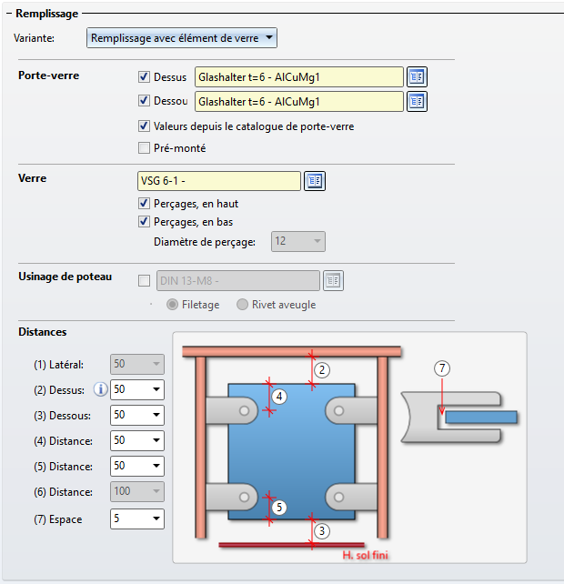 Dans ce cas, les champs (1) Latéral, (6) Distance et Diamètre de perçage sont alors condamnés. Indiquez alors les valeurs pour