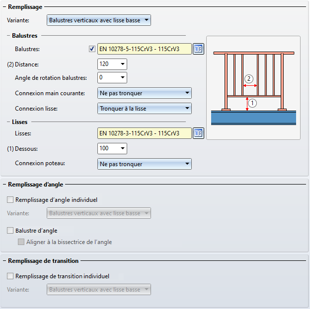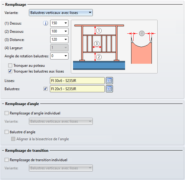 Comme remplissage, vous pouvez utiliser au choix des sous-lisses, des éléments de verre, des balustres verticaux avec ou sans lisse, des balustres verticaux avec lisse basse et des balustres verticaux avec cadre. Le remplissage pour les angles et les transitions (d'escalier/de palier) sera défini séparément. Cela est cependant possible uniquement si la ligne directrice indique les angles ou les transitions et que la création de poteaux d'angle ou de transitions est décochée dans l'onglet Répartition de poteau.