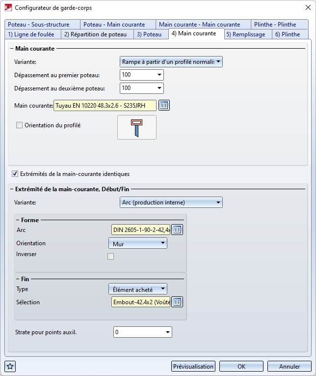 Vous avez en outre la possibilité de définir l'extrémité de la main courante à son début et à sa fin. Sont disponibles des embouts plats ou sphériques, ainsi que des arcs avec ou sans embout ou avec une platine de tôle en acier. Les arcs peuvent être orientés au choix en fonction du mur ou du sol et peuvent également être inversés en cochant la case correspondante.