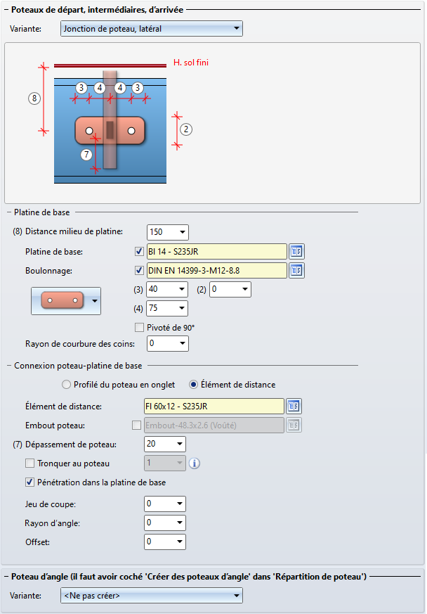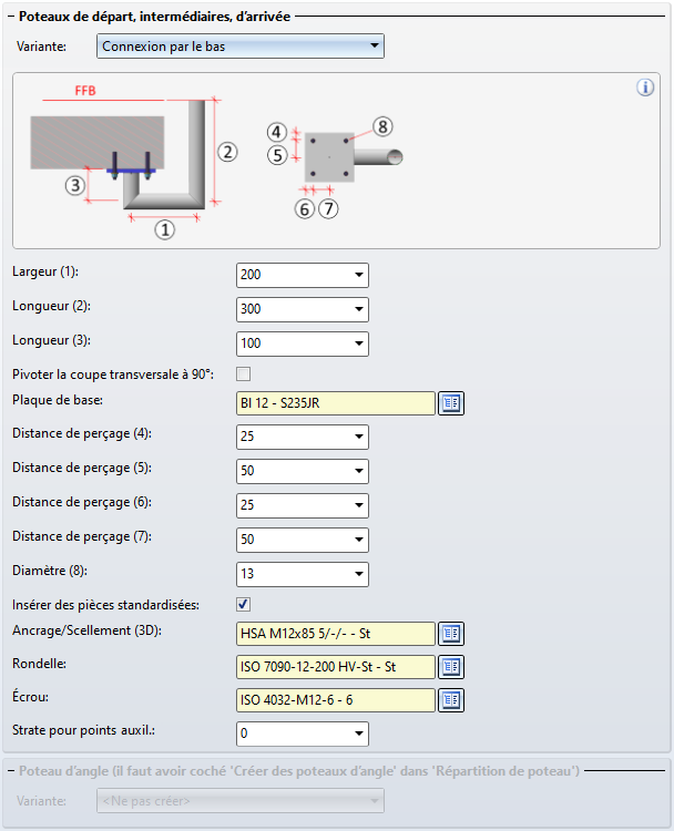 Même si vous avez coché ici Tous les poteaux sont identiques, les paramètres des onglets Poteau - Sous-structure et Poteau - Main courante ne seront pas pris en compte pour les poteaux d'angle et de transition ! Les connexions des poteaux d'angle et de transition doivent donc être paramétrées manuellement.