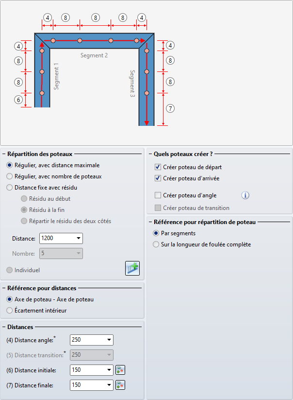 En cochant la case correspondante, vous déterminez quels poteaux devront être créés. La création de poteau d'angle ou de transition n'est possible si la case Par segments est cochée sous Référence pour répartition de poteau et que la ligne directrice indique un angle ou une transition.