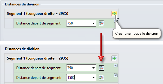 Les distances de division peuvent au choix être définies par saisie des distances à partir du départ du segment ou par détermination d'un point de division.