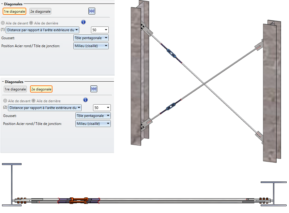 Le contreventement en croix 2602 illustré a été sélectionné avec des paramètres suivants pour la 1ère et la 2ème diagonale.