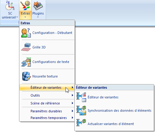 via l'onglet Scène, accessible sous Extras, dans le sous-menu Éditeur de variantes :