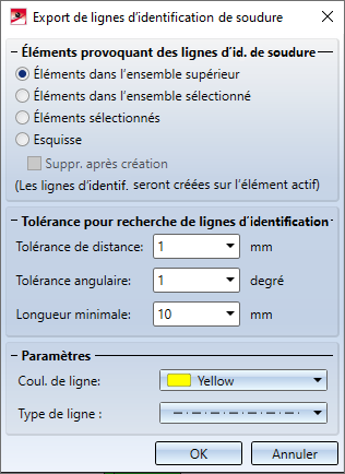 Après avoir lancé la fonction Lignes d'identification des soudures, la fenêtre de dialogue suivante s'ouvre :