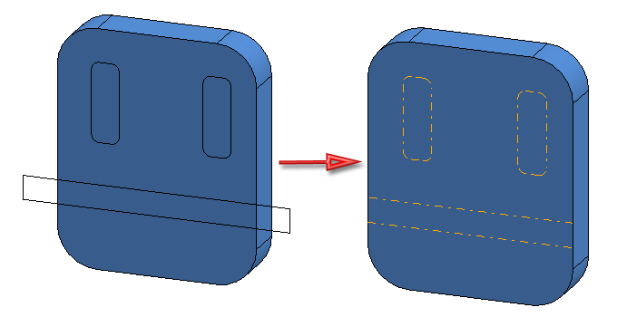 Si vous choisissez cette option, les lignes d'une esquisse peuvent être transférées comme lignes d'identification sur l'élément. Les lignes de l'esquisse doivent impérativement se trouver sur la surface de l'élément et seront au besoin raccourcies à la surface, c'est-à-dire que les lignes excédantes ne seront pas reprises comme lignes d'identification. Si la case Supprimer après création est cochée, l'esquisse sera alors automatiquement supprimée après la création des lignes d'identification. Nous portons à votre attention que les éléments d'esquisse définis comme géométrie auxiliaire ne seront pas repris comme lignes d'identification.