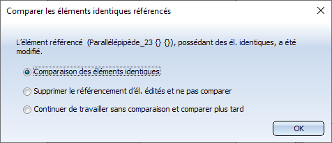 Si c'est le cas, il peut être alors enregistré directement. Cela amène à ce que, lorsque plusieurs "jumeaux" d'un élément identique ont été modifiés de façon différente, la modification sur les autres jumeaux déjà modifiés sera perdue. Si par exemple, lorsqu'un élément identique comporte un chanfrein et un autre élément identique du même élément référencé comporte un arrondi, une des deux modifications sera alors perdue.
