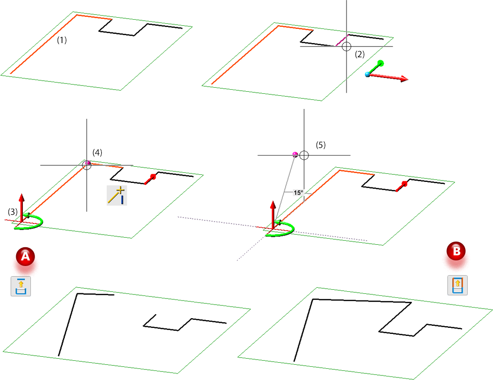 (1) Lignes-éléments sélectionnées, (2) Direction du déplacement, (3) Sélection du point de rotation, (4) Sélection des 2 points, (5) Angle de 15°