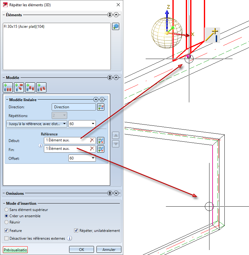 Nous sélectionnons le barreau à copier, lançons la fonction Répétition paramétrique et sélectionnons Ajouter modèle linéaire . Nous procédons aux paramétrages suivants :