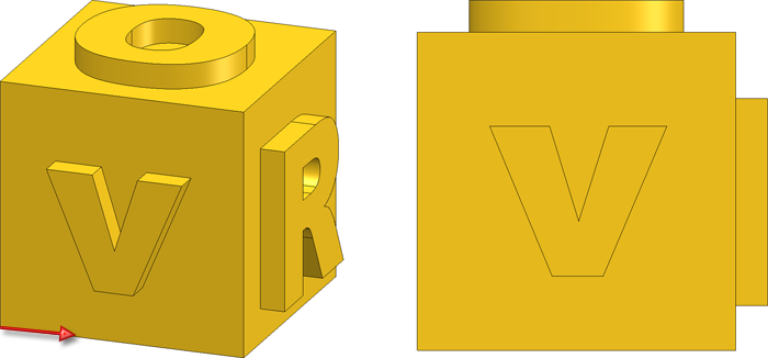 Dans cet exemple, l'ensemble (à gauche) doit être déplacé le long de l'arête indiquée. Pendant la simulation, la vue devra changer plusieurs fois. La vue d'origine est la vue de face.