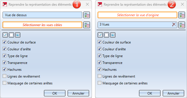 La fenêtre de dialogue varie selon qu'une seule vue est active lors de l'exécution de la fonction (1) ou que plusieurs vues sont sélectionnées dans l'ICN (2).