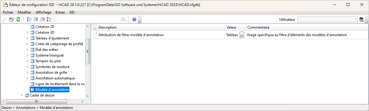 Après le démarrage de HiCAD, lors de la création d'une nouvelle scène ainsi que lors du chargement de scènes enregistrées avec une version antérieure à HiCAD 2023, les valeurs des paramètres définies dans l'Éditeur de configuration sous Dessin > Annotations > Cotation 3D sont actives.