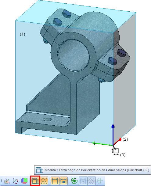 De plus, le parallélépipède enveloppant est identifié par un symbole (3) qui indique l'actualité des dimensions ainsi que la source de l'orientation.