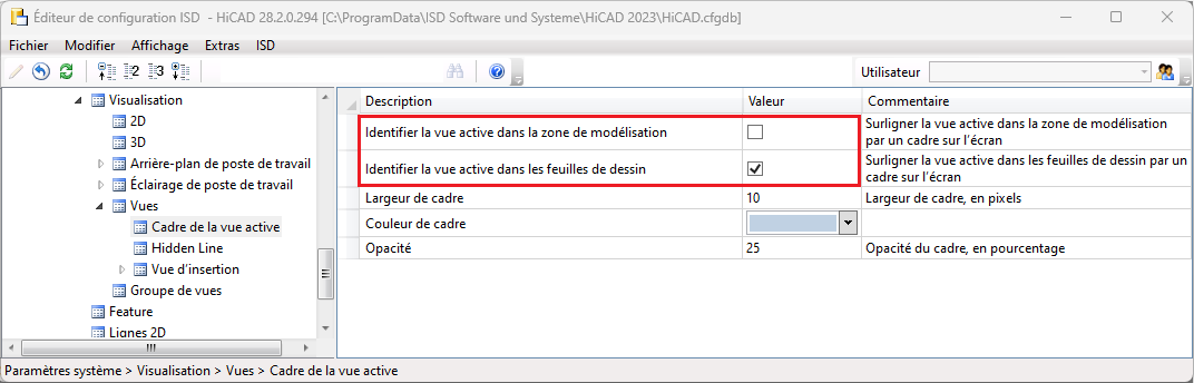 sous Paramètres système > Visualisation > Vues > Cadre de la vue active dans le Gestionnaire de Configuration.