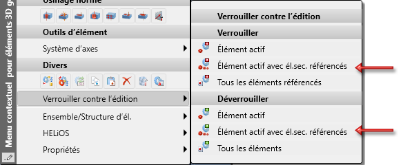 Grâce à cette extension d'application, les fonctions pour le verrouillage contre l'usinage sont désormais disponibles dans un sous-menu séparé et non plus dans le menu Fonctions de référencement comme auparavant. Vous accédez à cette fonction via le menu contextuel pour les éléments, puis via l'entrée Verrouiller contre l'édition.