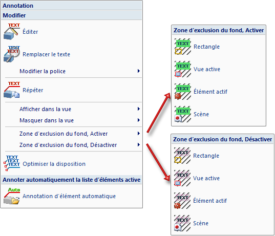 - Il est également possible de définir ou d'annuler des évidements de fond en une seule étape pour plusieurs annotations. Pour ce faire, les fonctions correspondantes sont disponibles sous Cotation+Annotation 3D > Texte > Annotation d'élément, avec texte libre et ligne de renvoi > Zone d'exclusion du fond, Act. ou Cotation+Annotation 3D > Texte > Annotation d'élément, avec texte libre et ligne de renvoi > Zone d'exclusion du fond, Désact.