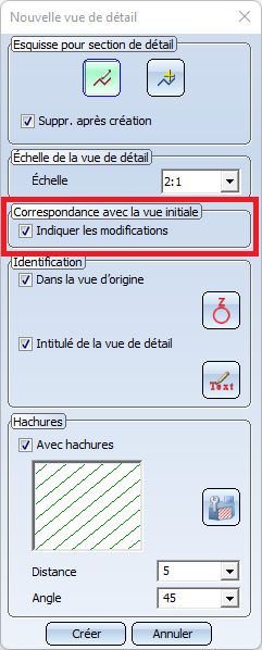 - Si la vue initiale est une vue en coupe avec des hachures, les paramètres de hachures sont également intégrés à la vue de détail. Les paramètres de hachures dans les boîtes de dialogue Nouvelle vue de détail et Modifier la vue de détail sont alors verrouillés.