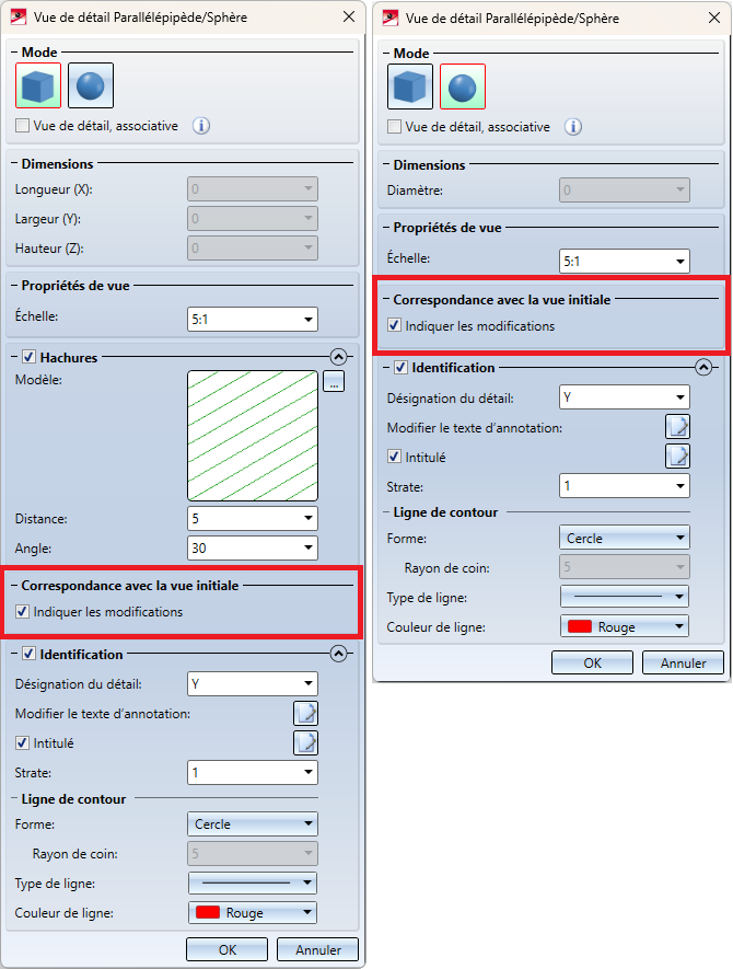 - Une vue de détail associative ne peut pas changer de vue initiale. L'identification du contour du détail n'est possible que dans cette vue initiale.