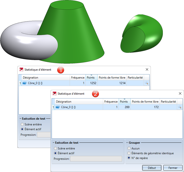 Dans la figure, l'intersection du cône et du tore a été entreprise. (1) montre le nombre de points de forme libre avant HiCAD 2023, (2) leur nombre dans HiCAD 2023.