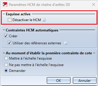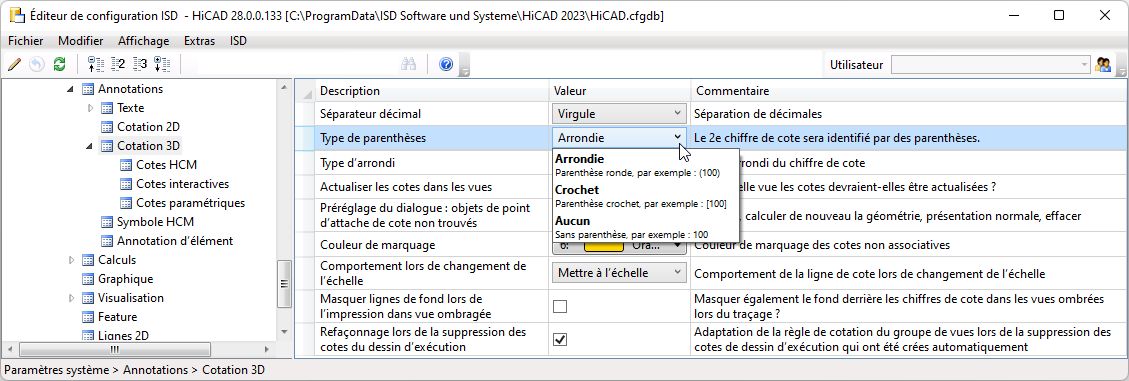 Le paramètre par défaut peut être défini dans le Gestionnaire de Configuration sous Paramètres système > Annotations > Cotation 3D.