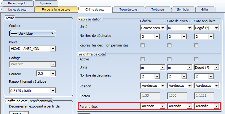 Cela peut être paramétré dans l'onglet Chiffre de cote de la fenêtre de dialogue des paramètres de cote. Cela s'applique aussi bien aux cotes générales qu'aux cotes paramétriques et aux cotes HCM.