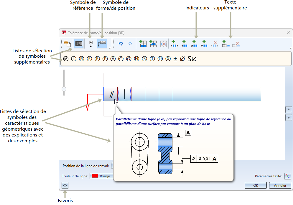 permet de créer facilement des tolérances avec symbole de référence (DIN EN ISO 5459) ainsi que des symboles de forme/de position (selon DIN EN ISO 1101 et 14405-1).