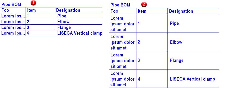 Previously, texts that were too long for a table cell were automatically shortened by HiCAD. The shortening was marked by an ellipsis (...). As of HiCAD 2023 SP2, texts that are too long are wrapped.