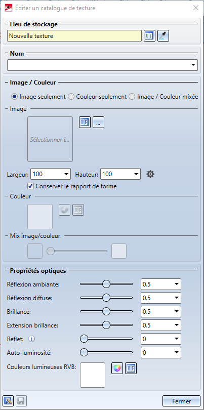Les champs Largeur et Hauteur indique la taille de la texture. Si le rapport de forme doit être conservé, cochez alors la case correspondante.