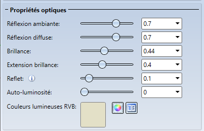 Il est possible d'attribuer différentes propriétés optiques à une texture. Celles-ci peuvent être déterminées soit par le curseur, soit par la saisie explicite de valeurs.