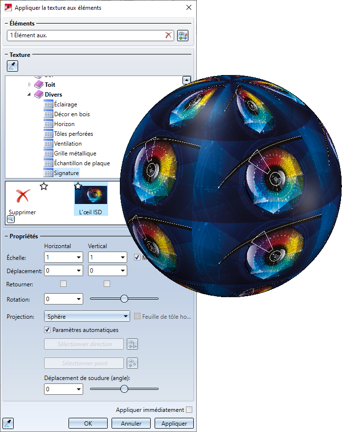 À partir de maintenant, la texture L’œil ISD est disponible dans la fonction Standard 3D > Outils > Attr. > Appliquer la texture aux éléments