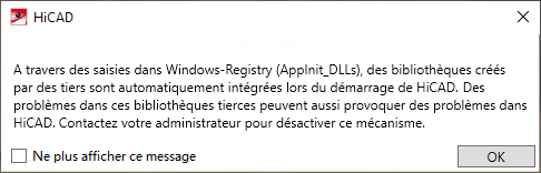Si vous souhaitez que ce message ne soit plus affiché aux prochains démarrages de HiCAD, activez la case Ne plus afficher ce message. Le cas échéant, veuillez en discuter avec votre administrateur. Le message ne réapparaîtra que dans le cas où la valeur Registry (de l'Éditeur du Registre) aura été modifiée ; autrement dit, quand d'autres fichiers DLL auront été chargés ! Pour ré-afficher ce message indépendamment de cette dernière action, il est possible dans le Registry de Windows sous