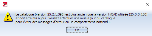 Si HiCAD est démarré avec un répertoire de catalogue antérieur (ex. : HiCAD 2500.1 avec le catalogue 2500.0 ou bien HiCAD 2600.0 avec le catalogue 2502.2), un message correspondant comme suit apparaîtra :