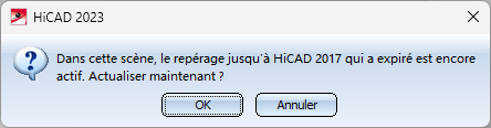 Dès lors que vous souhaitez lancer une des fonctions de repérage dans des scènes qui ont été créées avec une ancienne version de HiCAD (jusqu'à HiCAD 2017) et dans laquelle un repérage aura été, au moins en partie, effectué, le message suivant apparaîtra alors :