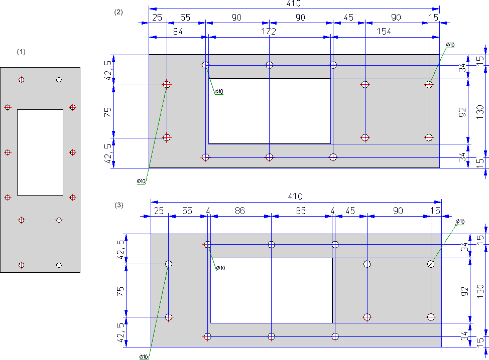 La scène illustrée (1) comprend plusieurs perçages débouchants et un découpage rectangulaire. (2) Séries de cote séparées, (3) une série de cote pour perçages et découpages