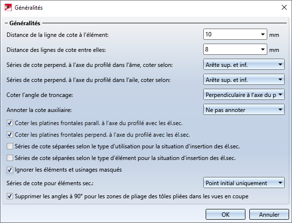 , il est possible sous Généralités de spécifier que les éléments attachés (profilés) dans les différentes séries de cote dépendant de l'attribut Type d'élément devront être cotés. Vous disposez pour cela dans la fenêtre de dialogue d'une case correspondante. Il est ainsi possible de coter les profilés creux / éléments attachés séparément des aciers ronds / élément attachés et d'améliorer ainsi la structuration des cotes.