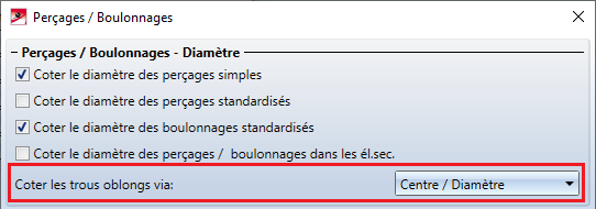 , il est dorénavant possible, sous Perçages / Boulonnages, de déterminer que les séries de cote séparées pour les perçages (perçage débouchant et standardisé) et pour les découpages devront être créées séparément. Vous disposez pour cela de la case Séparer les séries de cote pour les perçages et les découpages.