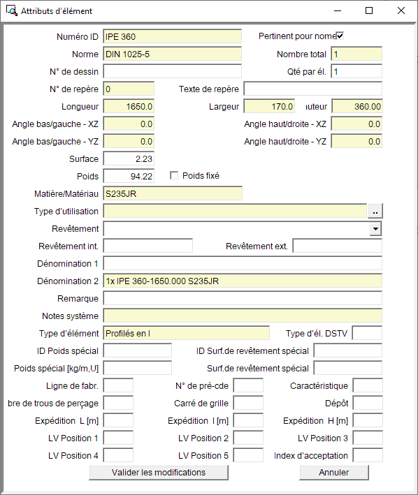 Certains de ces attributs seront affectés directement à la création de la scène ou à l'insertion d'éléments ou d'ensembles. D'autres pourront être complétés à l'aide des fonctions Attributs de scène et Attributs de l'élément (depuis le menu contextuel de la scène, respectivement de l'élément). Une fenêtre de dialogue Attributs de scène ou Attributs d'élément s'affiche alors. Le contenu de la fenêtre de dialogue dépend en fait de l'élément sélectionné (ex. Ensemble, Élément 3D, Tôle pliée, Profilé, Tuyauterie, etc.), ainsi que de la configuration des paramètres (Ingénierie mécanique, Charpente métallique/Enveloppes de bâtiment, Tuyauteries + Process, DSTV, Gestion de dessin).