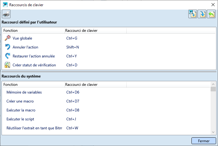 Une liste des raccourcis clavier actuellement définis par l'utilisateur ainsi que les raccourcis clavier système s'affiche dans une nouvelle fenêtre en cliquant sur le bouton Tous les raccourcis.