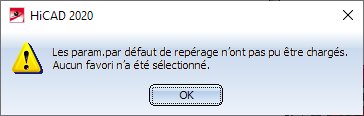 Si aucun fichier de paramètres par défaut n'a été sélectionné dans le Gestionnaire de Configuration, le message suivant apparaît alors au lancement du repérage automatique :