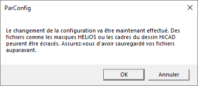 Si vous confirmez avec OK, les attributs, les paramètres du Gestionnaire de Configuration, les modèles de nomenclatures, les modèles d'annotations, les cadres de dessin, ainsi que les masques HELiOS seront configurés automatiquement pour l'utilisation de la Gestion de dessin. Notons, entre autres, que plusieurs fichiers systèmes seront fournis dans les répertoires sys et szenen de HiCAD par le répertoire HiCAD templates\Module_3DSteel\BIM et d'autres fichiers seront remplacés spécifiquement en fonction de la gestion des dessins. Il s'agit par exemple