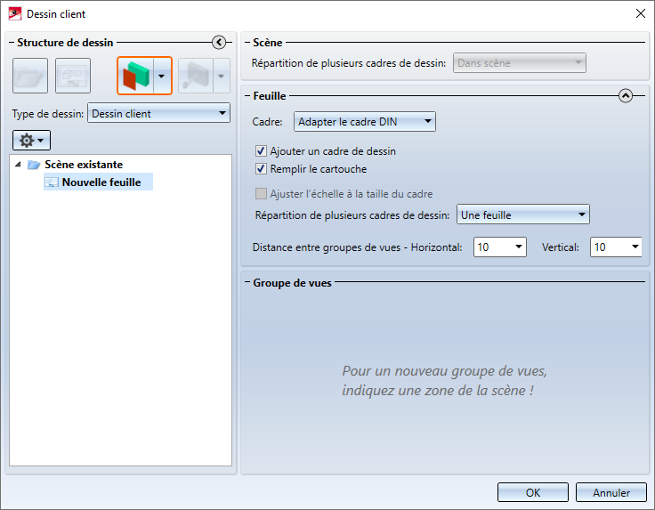 Les dessins client peuvent également être retravaillés, c'est-à-dire que les paramètres sélectionnés lors de la création du dessin client peuvent être modifiés. Par exemple, il est possible d'ajouter des vues, de supprimer des vues, de modifier la distance entre les vues, etc. Il n'est toutefois pas possible de modifier des éléments du dessin ni d'en ajouter de nouveaux.
