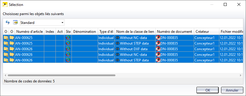 . - Dans le masque de sélection s'affichent alors, en fonction des paramètres du Gestionnaire de Configuration, toutes les données de fabrication qui n'existent pas encore. Sélectionnez les toutes et cliquez sur OK.