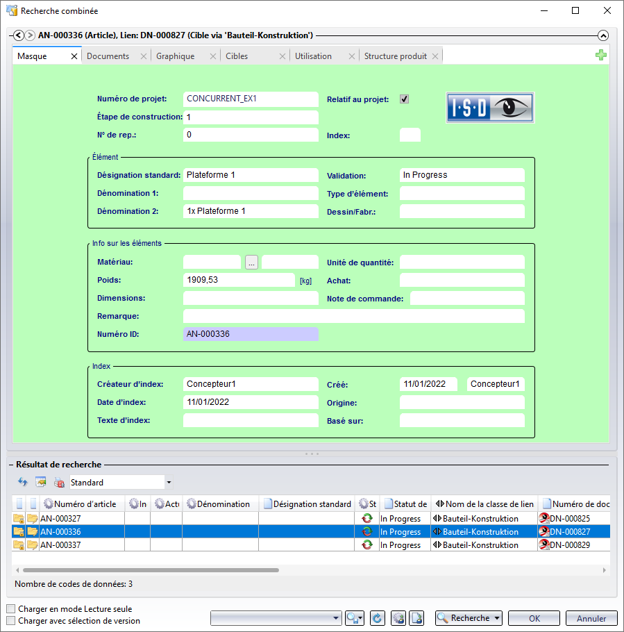Lors du repérage et de l'enregistrement du dessin d'élément individuel avec la fonction sous Gestion de dessin, tous les articles montés dans le dessin reçoivent automatiquement ce numéro d'étape. Grâce au lien Étape de construction (Construction unit), il est possible de rechercher de manière ciblée dans HELiOS tous les articles appartenant à un dessin. Cela facilite la recherche dans les constructions complexes.